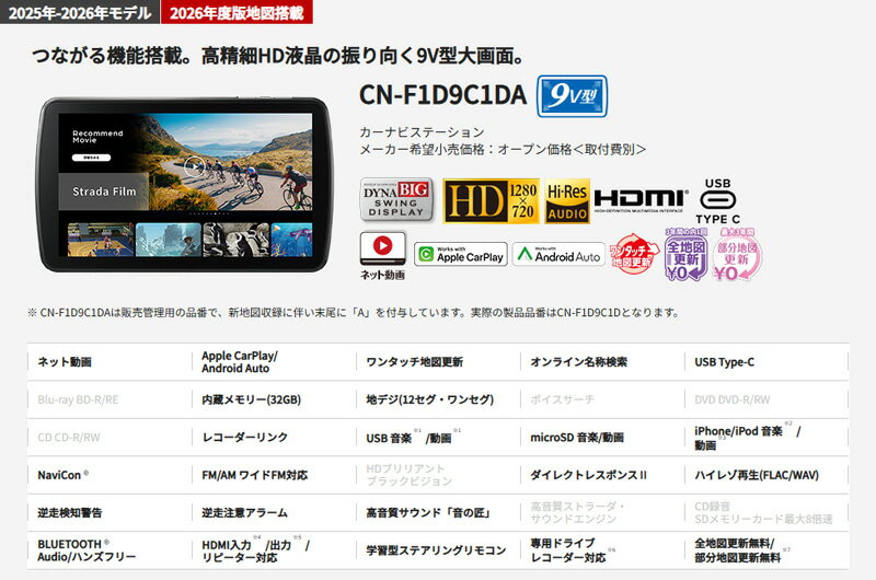 【取寄商品】パナソニック9V型ストラーダCN-F1D9C1DA+バックカメラCY-RC110KD+ジムニー/シエラ/ノマド(JB64W/JB74W/JC74W)取付キットセット